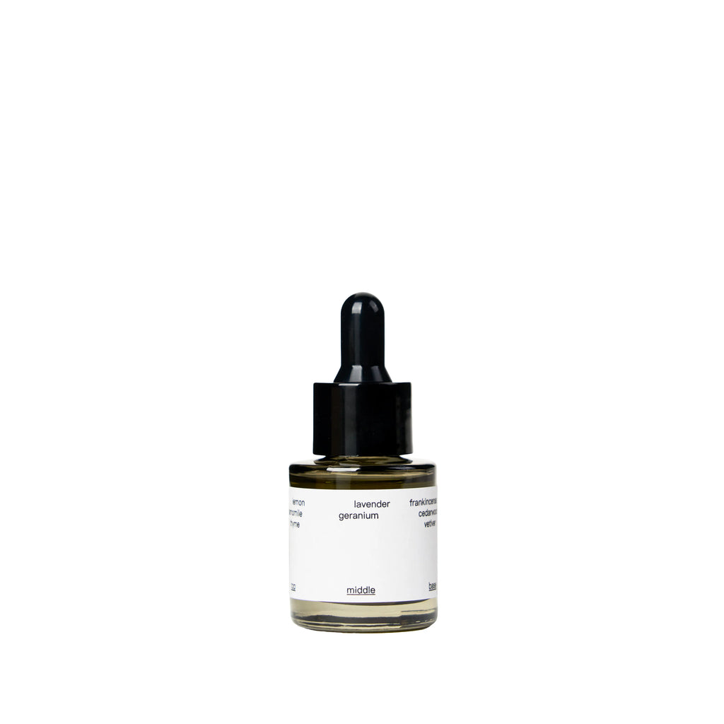 Bright lemon, chamomile, and thyme open this fragrance, followed by geranium and earthy lavender. Cedarwood and frankincense round it out with a calming, woody finish.