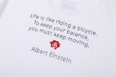 The cotton t-shirt has a relaxed fit and it features the embroidered Albert Einstein slogan “Life is like riding a bicycle. To keep your balance, you must keep moving.” at the back.