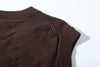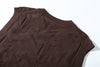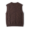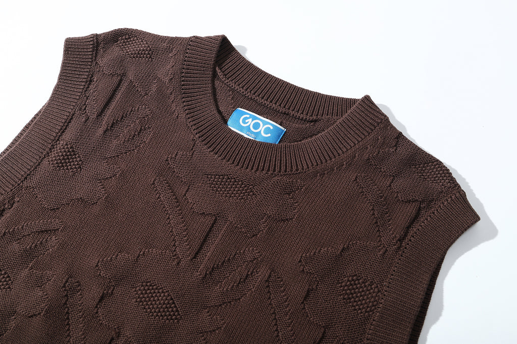 The knit vest has a ribbed crew neck and armhole, as well as wide ribbing at the hemline.