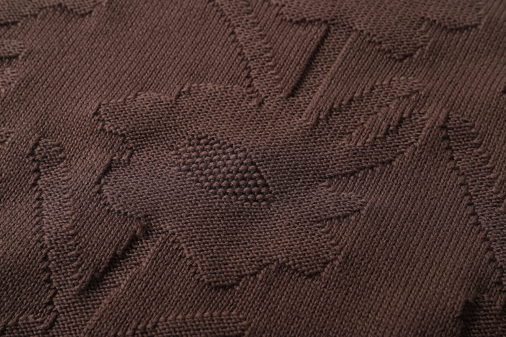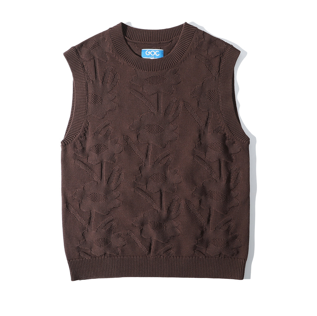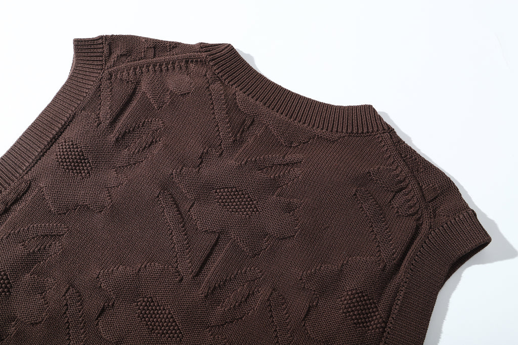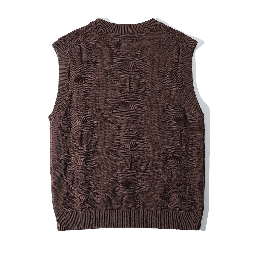 The knit vest has a relaxed fit and features a tonal color with a daffodils pattern in jacquard knit.