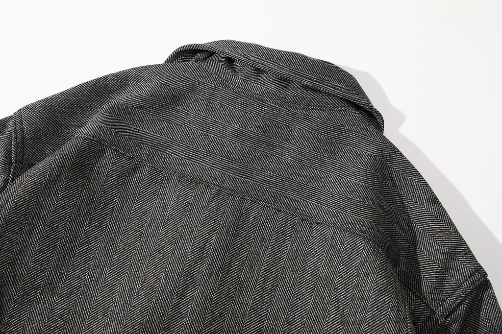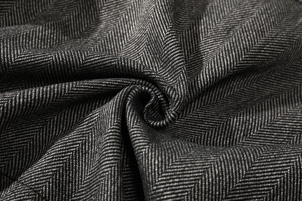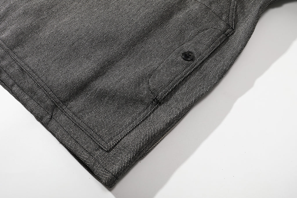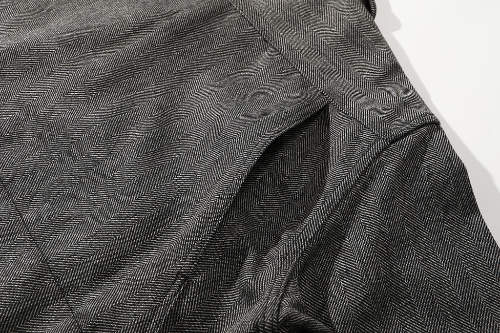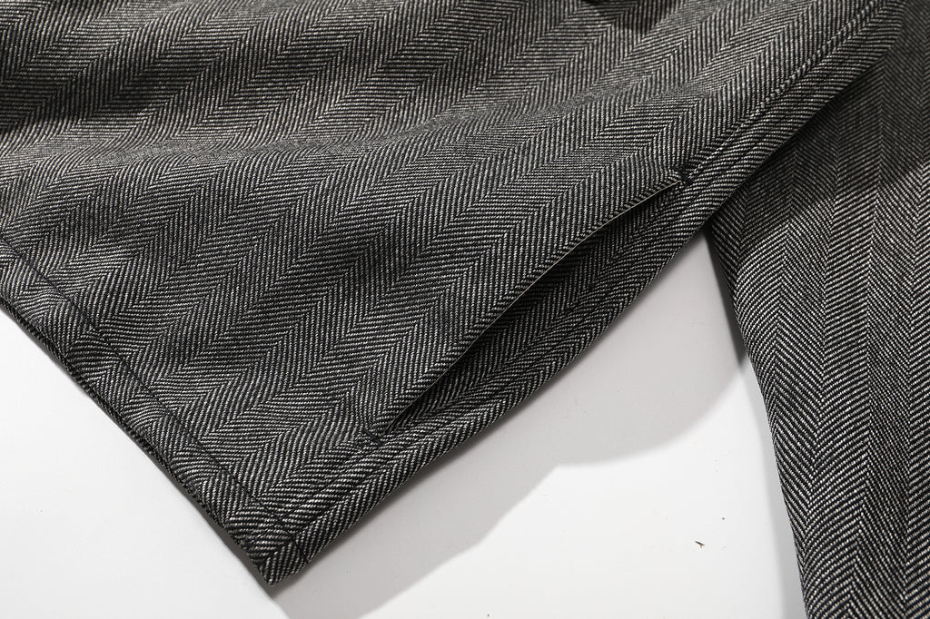This classic dark grey jacket is a versatile addition to any wardrobe. It is made of Japanese recycled wool tweed & herringbone fabric which features with subtle stripe pattern. Crafted with a distinctive herringbone weave, it offers a timeless and sophisticated look.