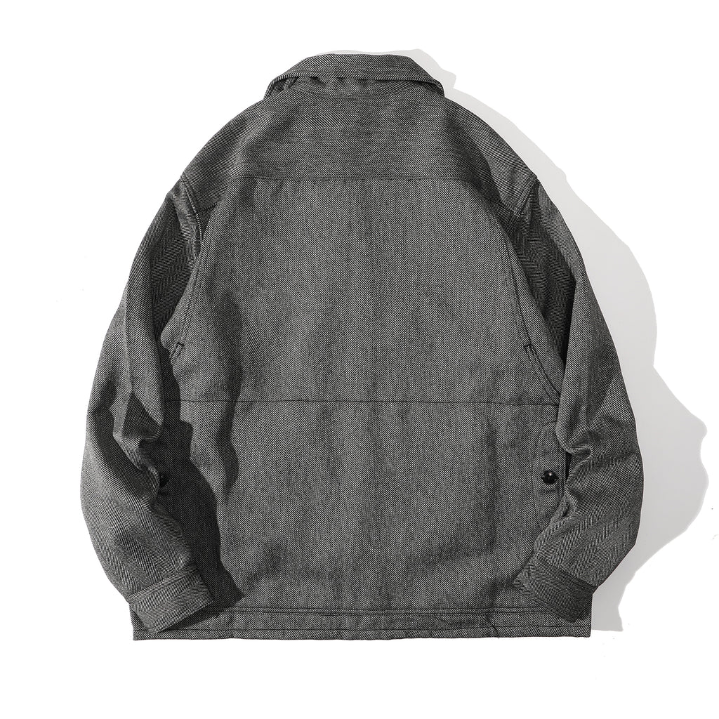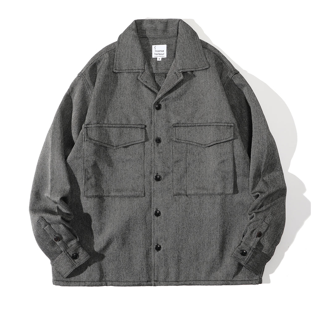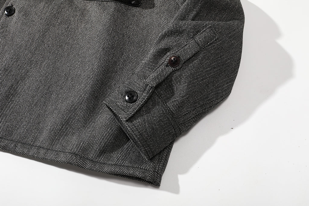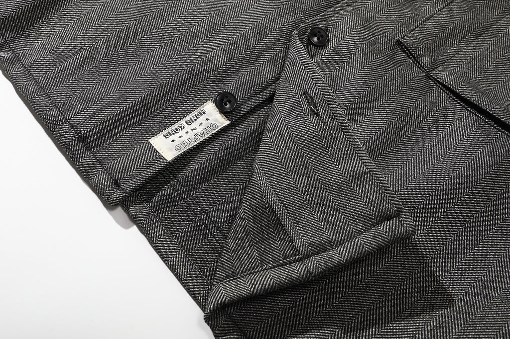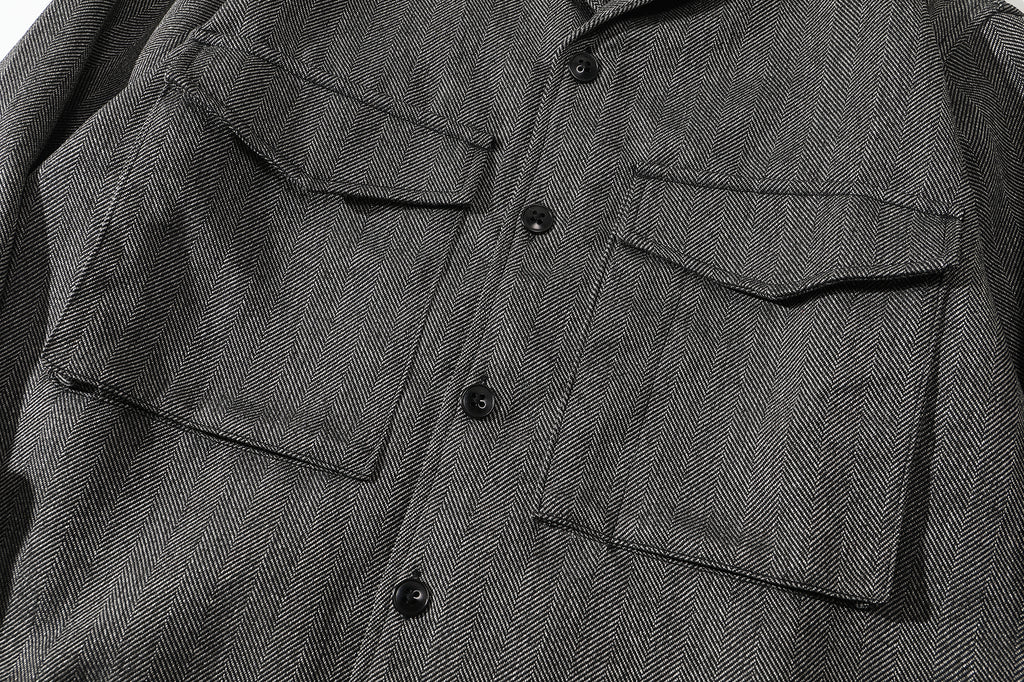 This classic dark grey jacket is a versatile addition to any wardrobe. It is made of Japanese recycled wool tweed & herringbone fabric which features with subtle stripe pattern. Crafted with a distinctive herringbone weave, it offers a timeless and sophisticated look.