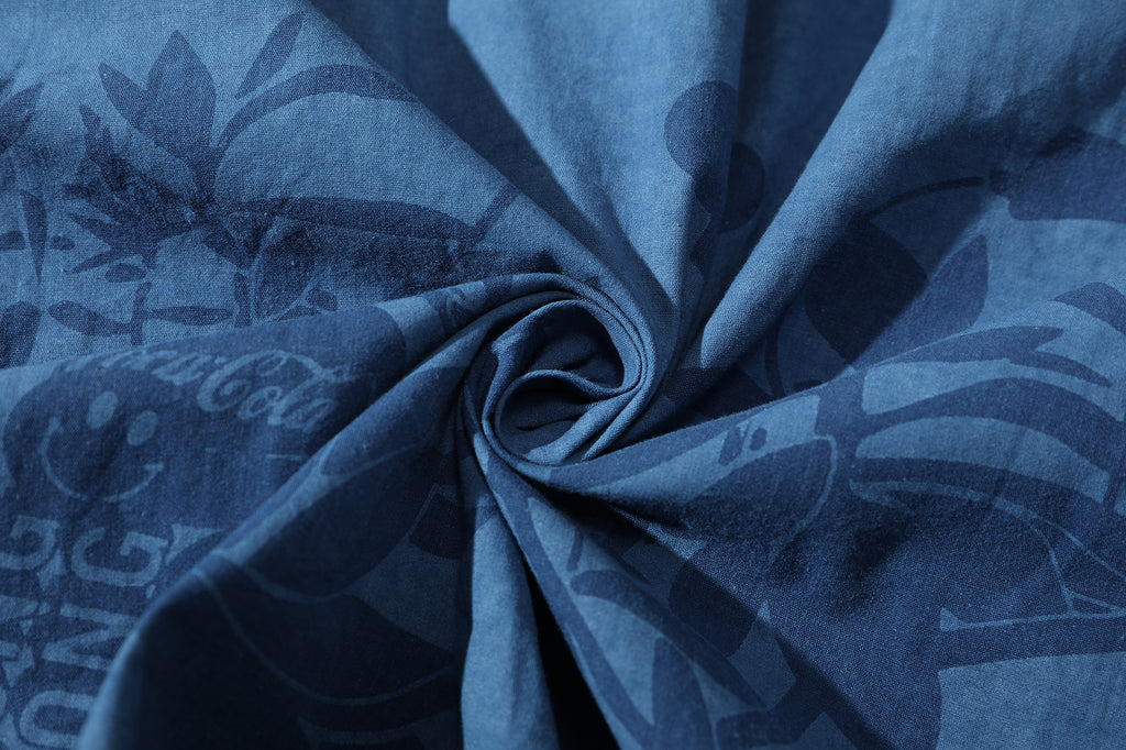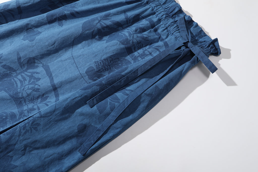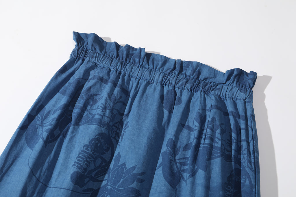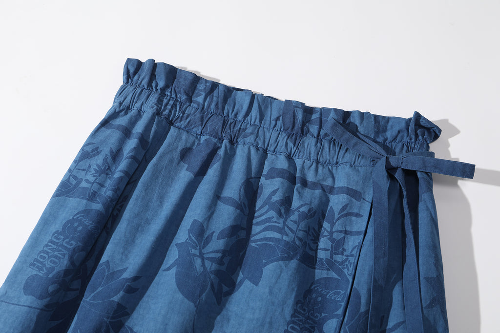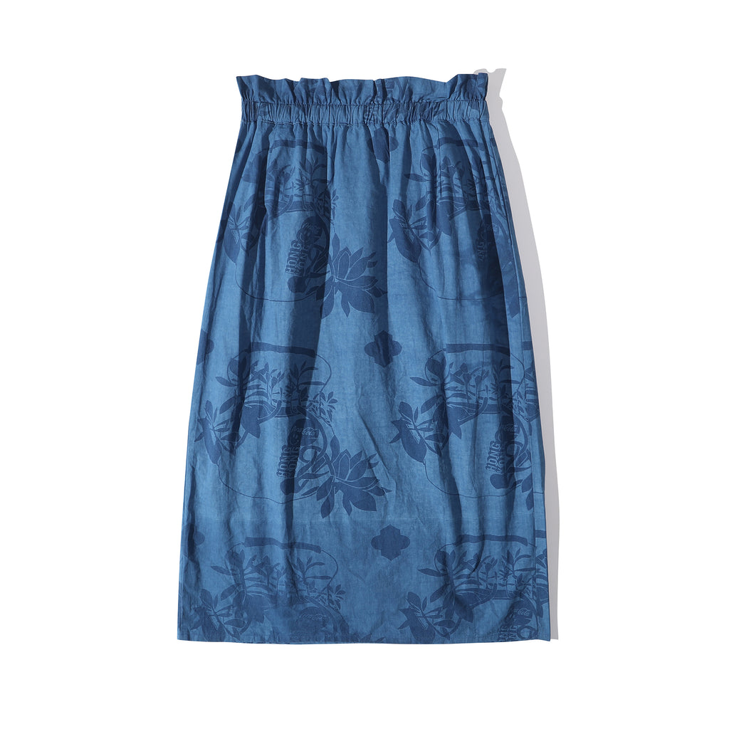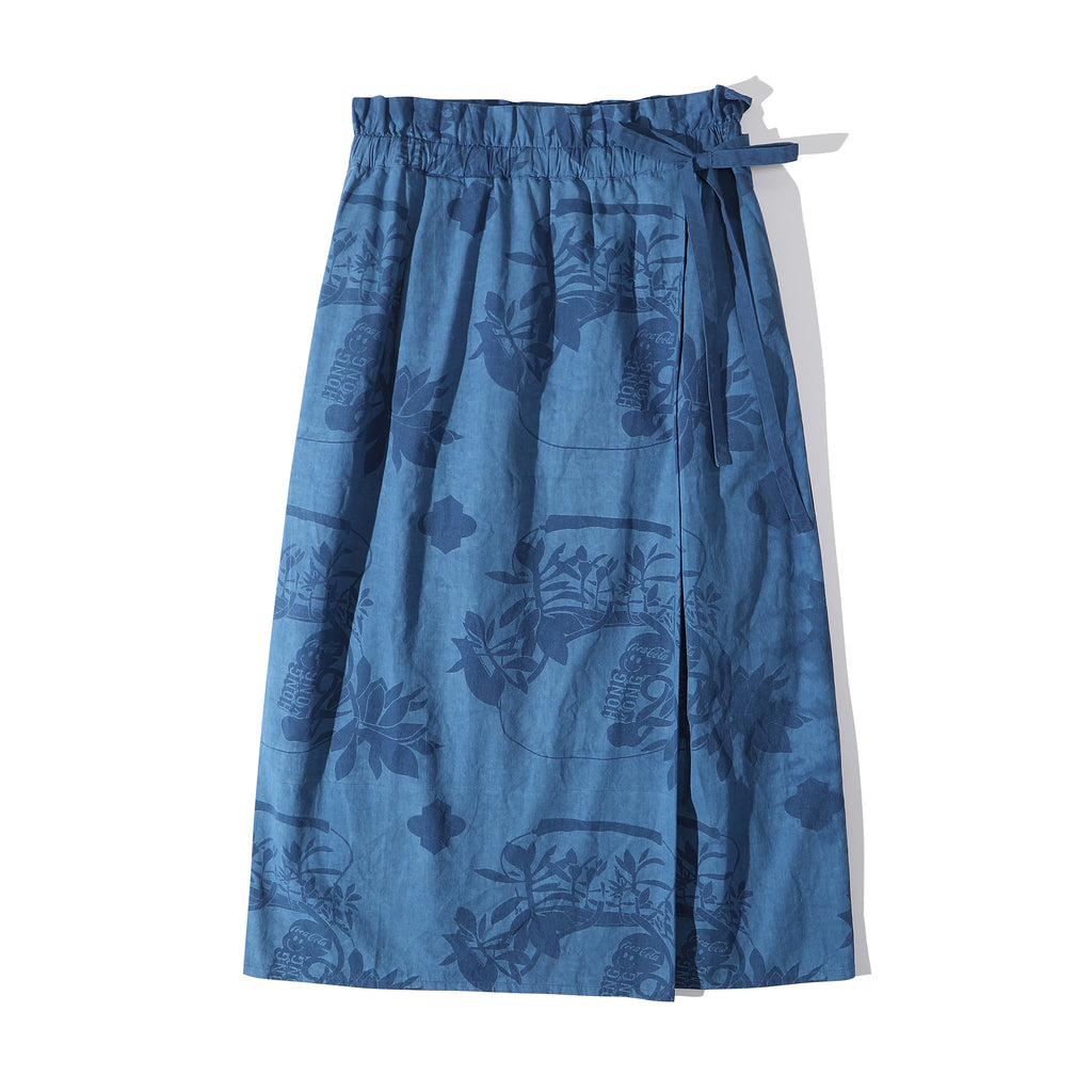 The ankle-length skirt is made of indigo dyed cotton fabric and it features with the discharged printing of Balcony Teapot.