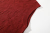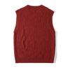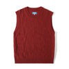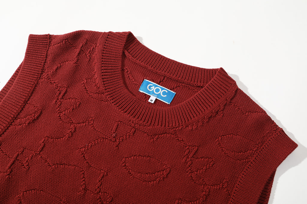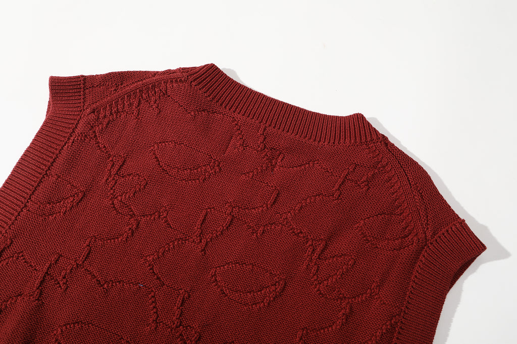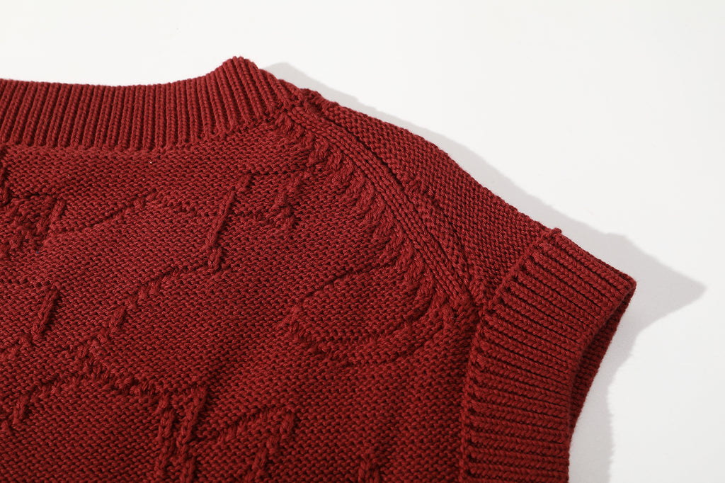 The knit vest has a ribbed crew neck and armhole, as well as wide ribbing at the hemline.