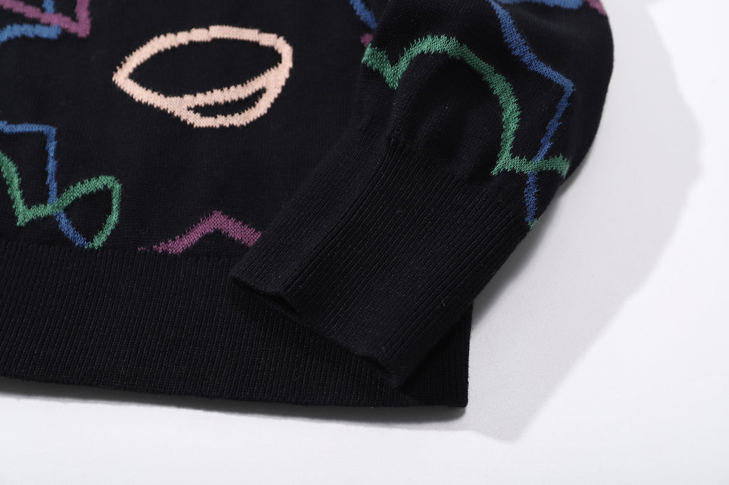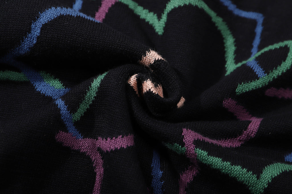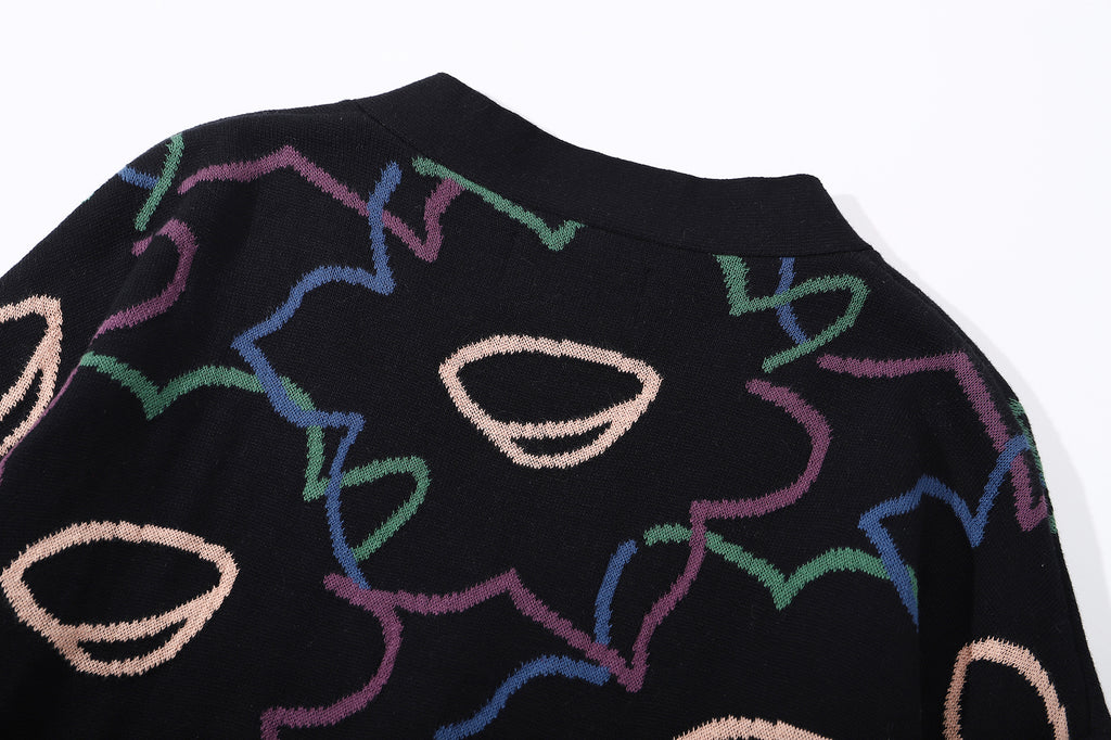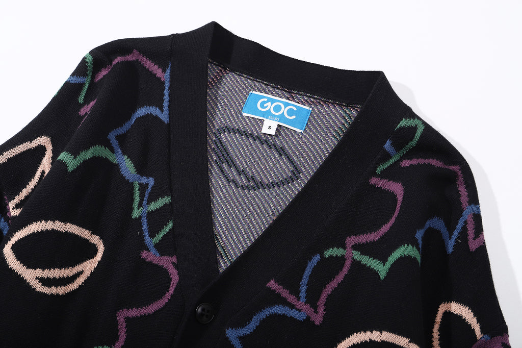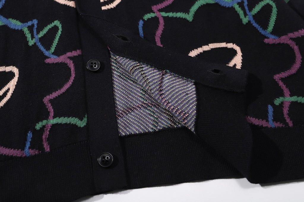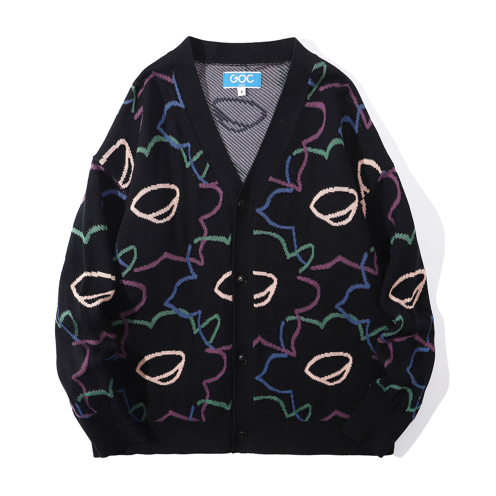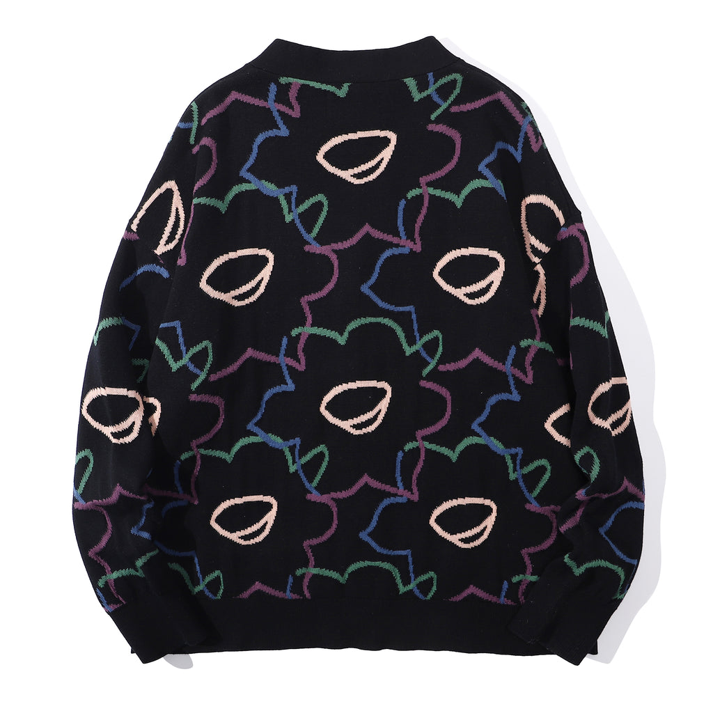 The cotton knit cardigan has a relaxed fit and it features the Friday Night Daffodils pattern in a jacquard knit.