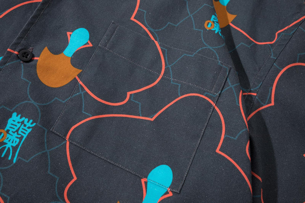 The pattern shirt has a relaxed and straight fit, the matching patterned front pockets and a corozo button closure.