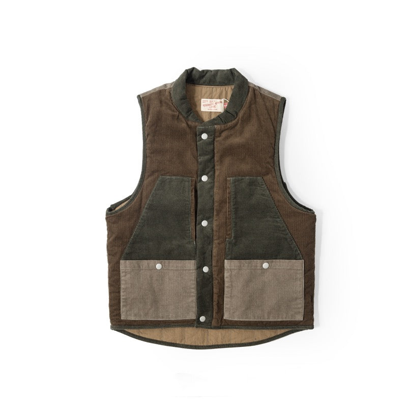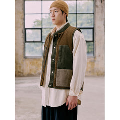 Retro design corduroy vest that can be worn both inside and out, with oversized cuffs for wearing over a jacket.