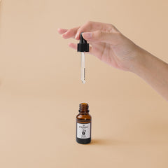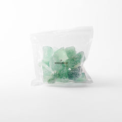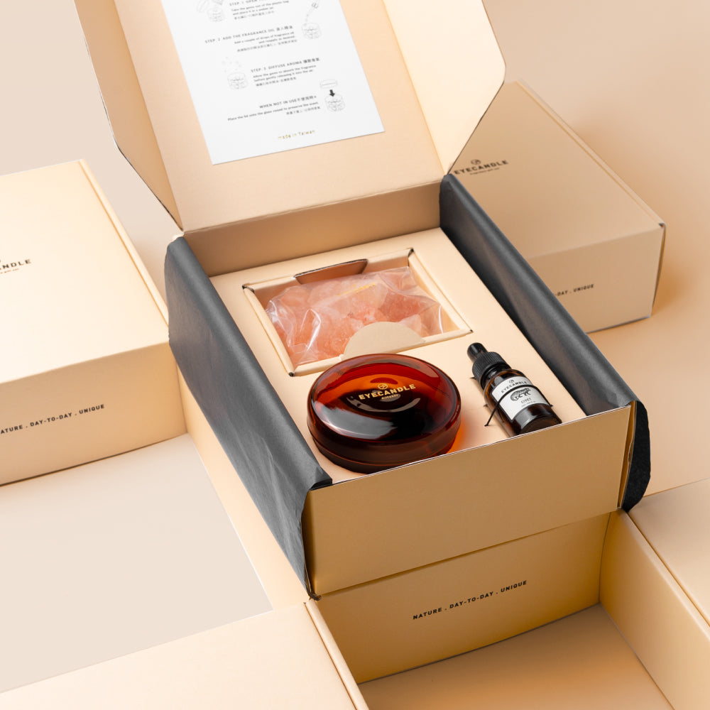 EYECANDLE customized gift box, a brown glass (with lid), a pack of raw ore, and a bottle of fragrance oil.