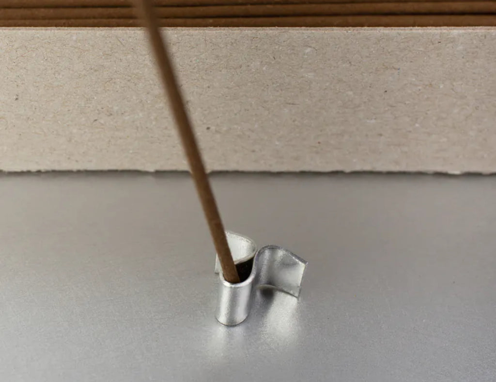 Fold the included tin sheet into a shape that can support the incense stick. Light one end, gently extinguish the flame, and insert the unlit end into the holder. Ensure there is sufficient space below to catch falling ash—use with a heat-resistant tray.