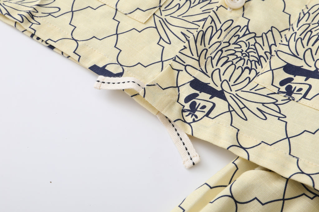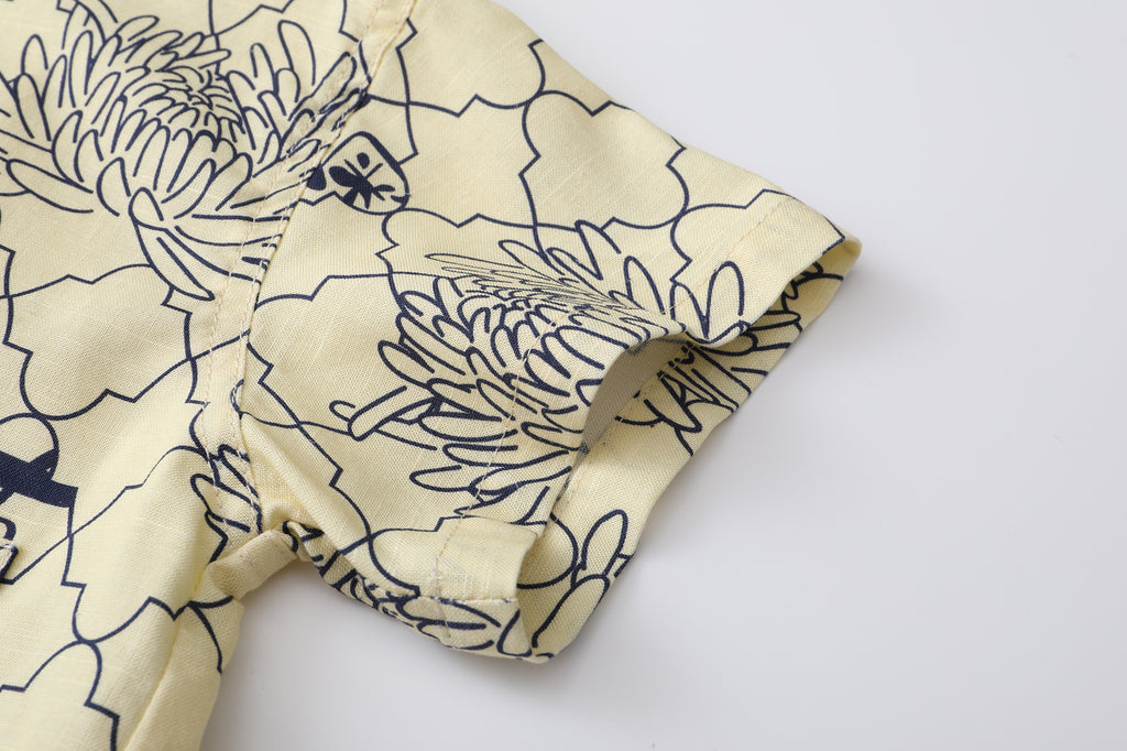 The kids' shirt and shorts set is made of breathable tencel linen fabric. It features the pattern of chrysanthemum mornings and is loose-fitted.