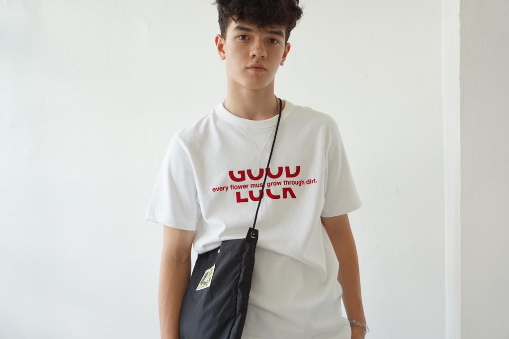 The cotton t-shirt has a relaxed fit and it features the large heat-sealed felt Good Luck slogan "every flower must grow through dirt." print in the front.