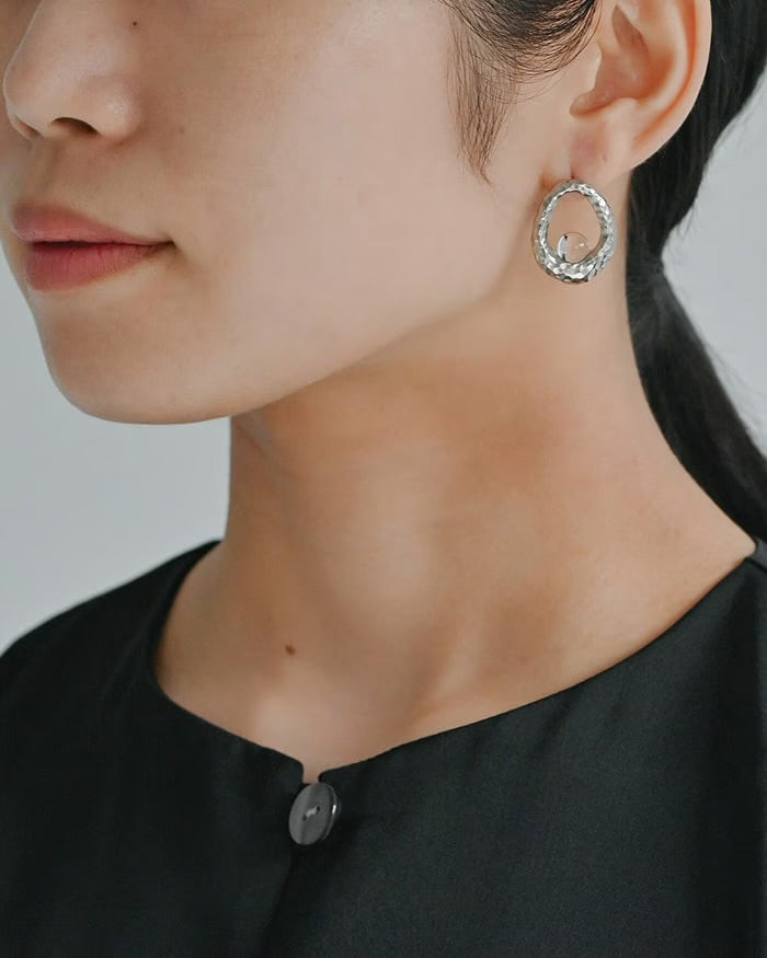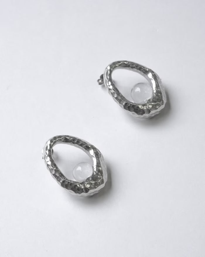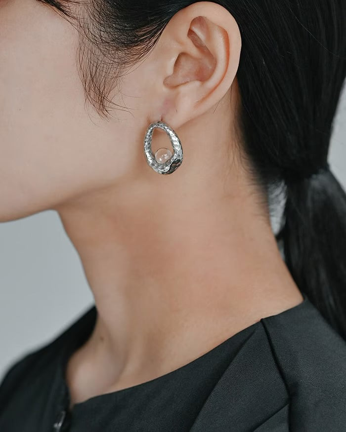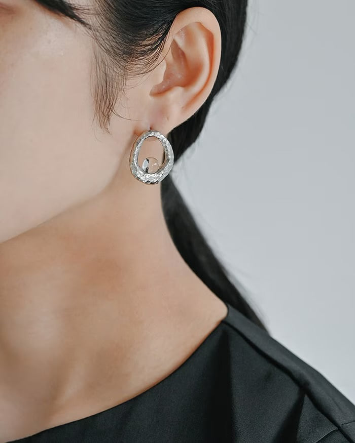 A shining glass sphere in an unbroken circle. The eye-catching tin ring adds a touch of glamour to your ears.